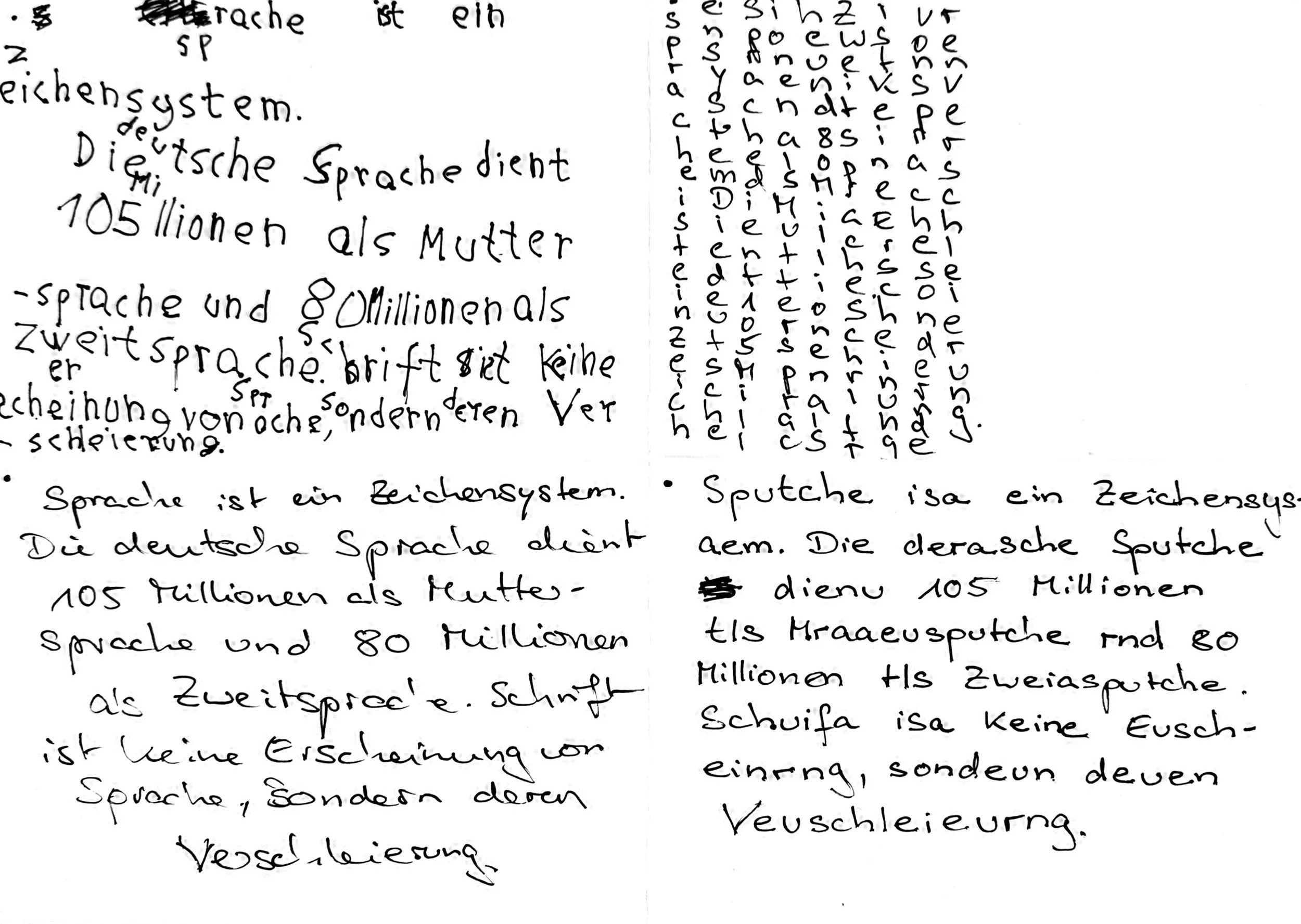 “Aber ich sehe eine Chance in dieser zerstörten Beziehung zur Muttersprache und zur Sprache überhaupt. Man wird ein Wort-Fetischist. Jeden Teil oder sogar jeden Buchstaben kann man anfassen und ändern, man sieht nicht mehr die semantische Einheit, und man lässt sich nicht im Fluss der Rede treiben. Man bleibt überall stehen und macht Nahaufnahmen der Details. Die Vergrößerung der Einzelteile ist verwirrend, weil sie vollkommen neue Bilder von einem vertrauten Objekt zeigt. Genau wie man durch ein Mikroskop die eigene Mutter nicht wiedererkennen kann, kann man die eigene Muttersprache bei einer Nahaufnahme nicht wiedererkennen. Aber in der Kunst geht es nicht darum, die Mutter so darzustellen, dass man sie wiedererkennt.”